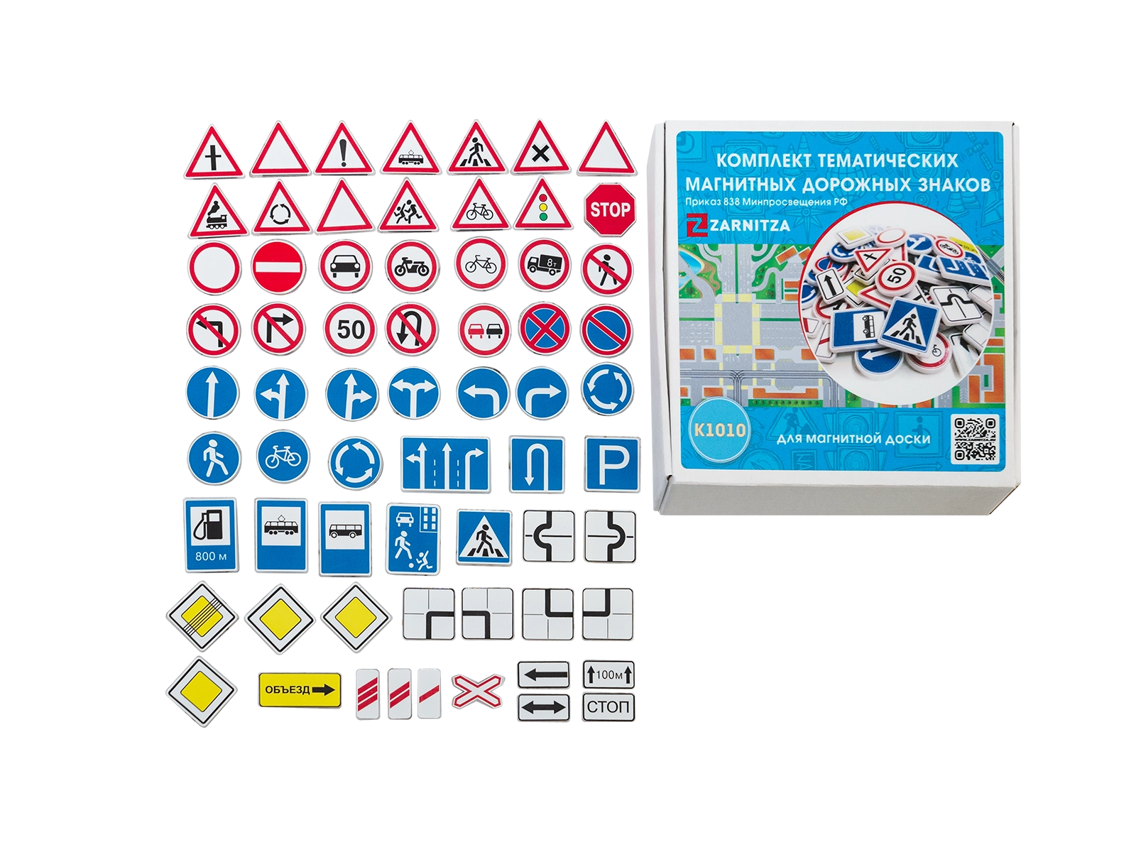 Комплект тематических магнитов предназначен для моделирования на магнитно-маркерных досках различных дорожных ситуаций с учетом значений дорожных знаков и наглядной демонстрации обучающимся правил дорожного движения.