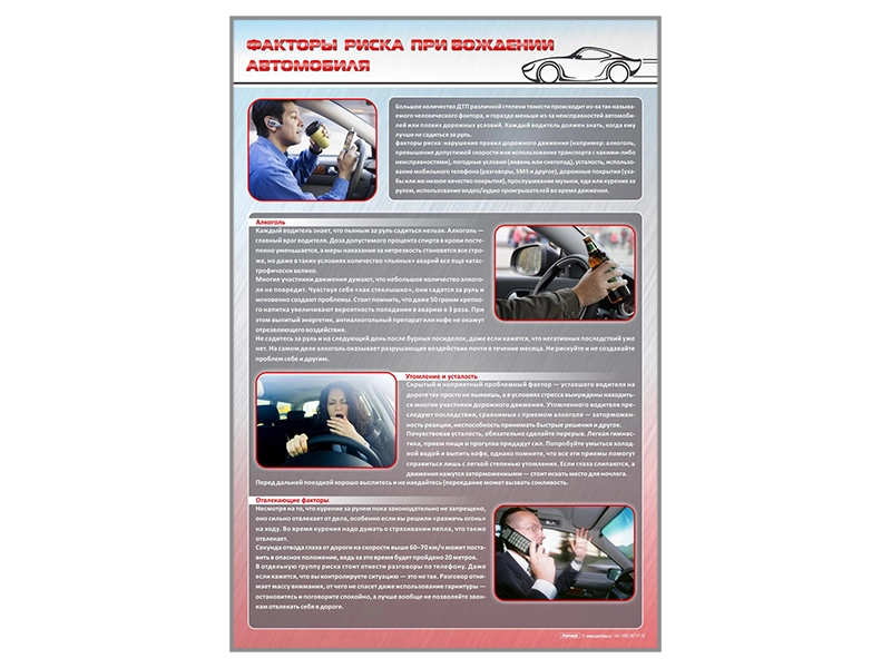 Стенд представляет собой информационную панель, на которой размещены сведения о факторах риска при вождении автомобиля.