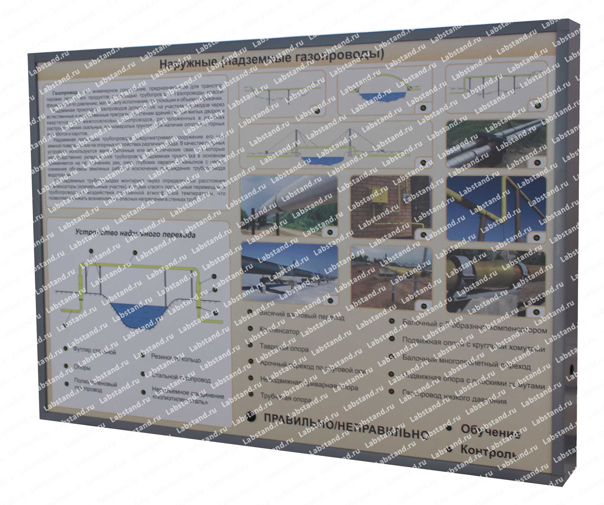 Назначение: Стенд-планшет предназначен для изучения принципа действия приборов и составных элементов надземных газопроводов.