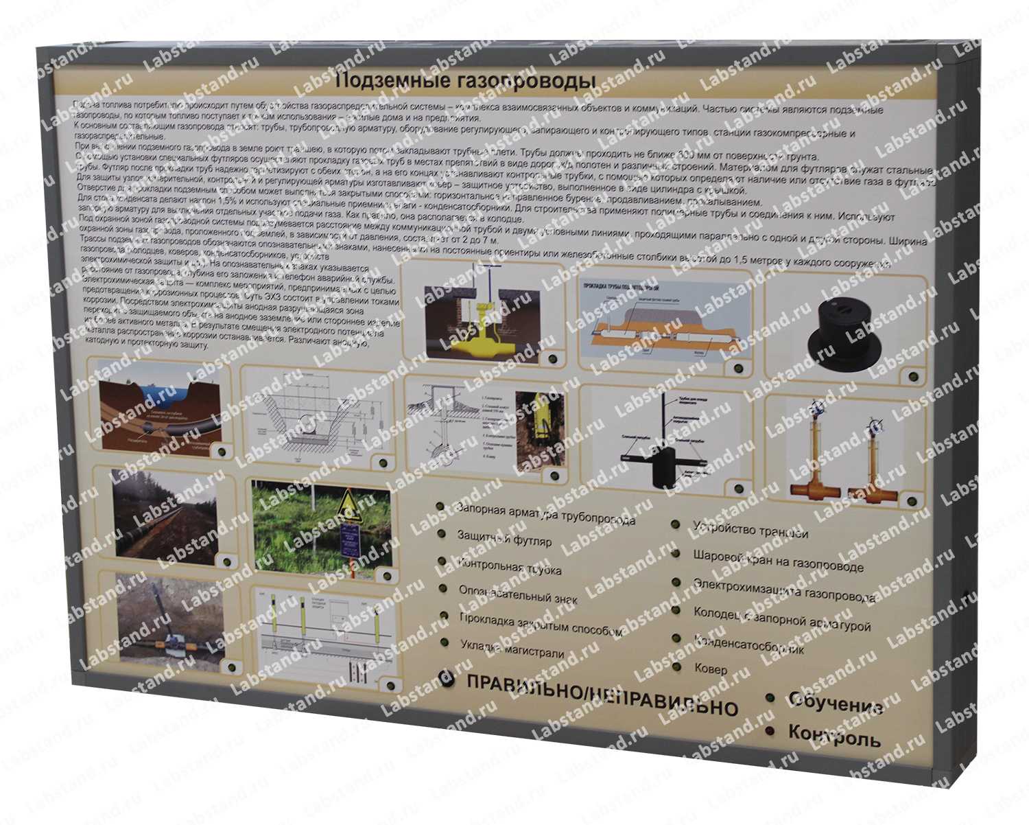 Назначение: Стенд-планшет предназначен для изучения принципа действия приборов и составных элементов подземных газопроводов.
