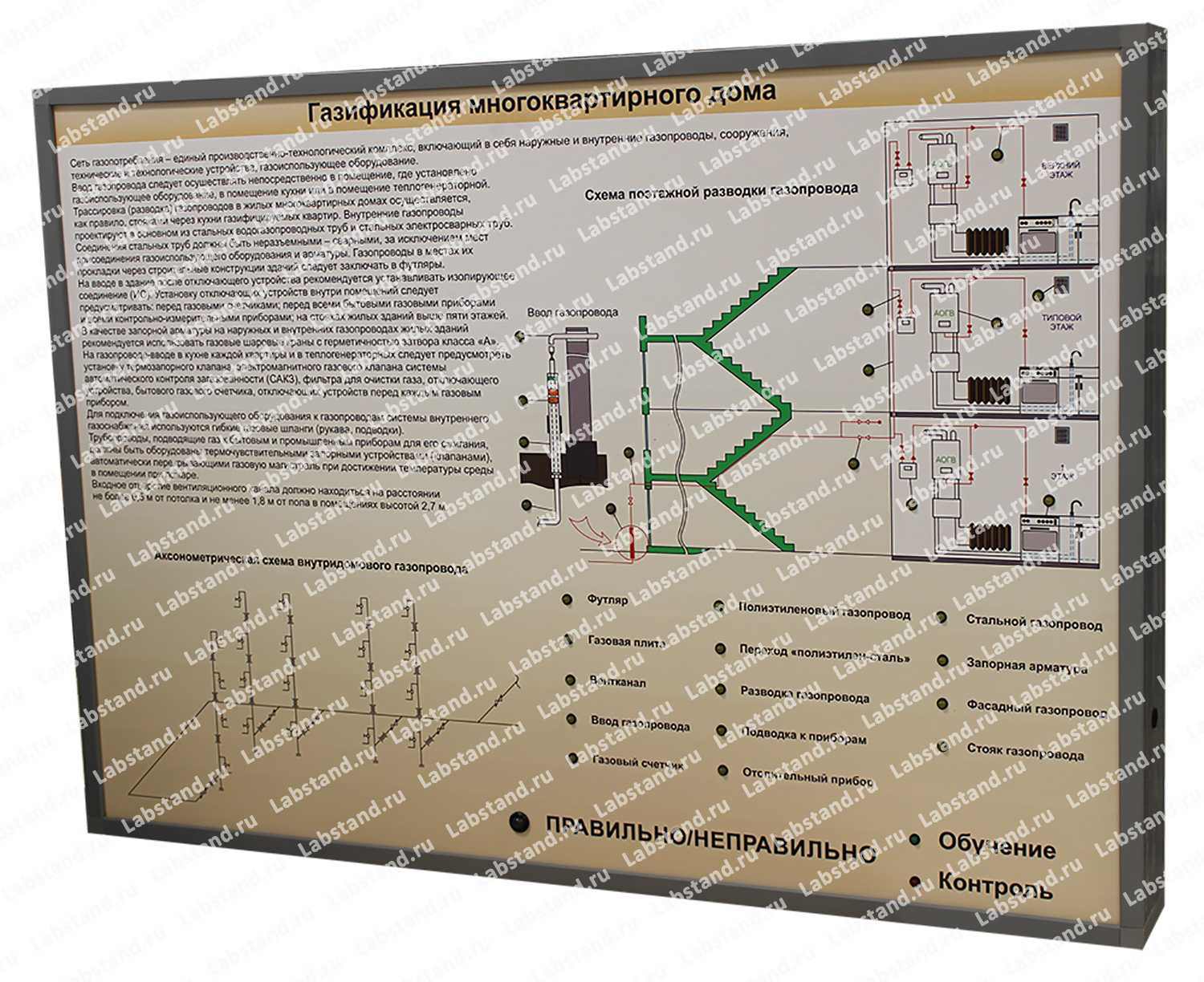 Назначение: Стенд-планшет предназначен для изучения схемы газификации многоквартирного дома, принципа действия приборов и составных элементов системы газоснабжения.