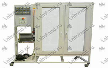 Учебный стенд содержит систему сбора данных и комплект датчиков, позволяющих определять температуры хладагента на входе и выходе конденсатора и испарителя первого контура охлаждения, температуры пропиленгликоля на входе и выходе воздушно-водяной теплообменника второго контура охлаждения, температуру окружающего воздуха в камере охлаждения, давление хладагента в линиях всасывания и нагнетания компрессора первого контура охлаждения.