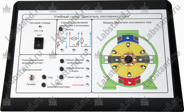 Модуль представляет собой моноблок со встроенной платой на безе микроконтроллера, который благодаря светодиодам наглядно визуализирует принцип работы двигателя постоянного тока .