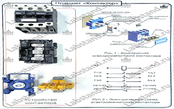 На лицевой панели планшета размещены изображения типовых схем подключения коммутатора, изображения принципов работы и конструкции, а так же установлены разрезы натуральных деталей и функциональных элементов реального контактора.