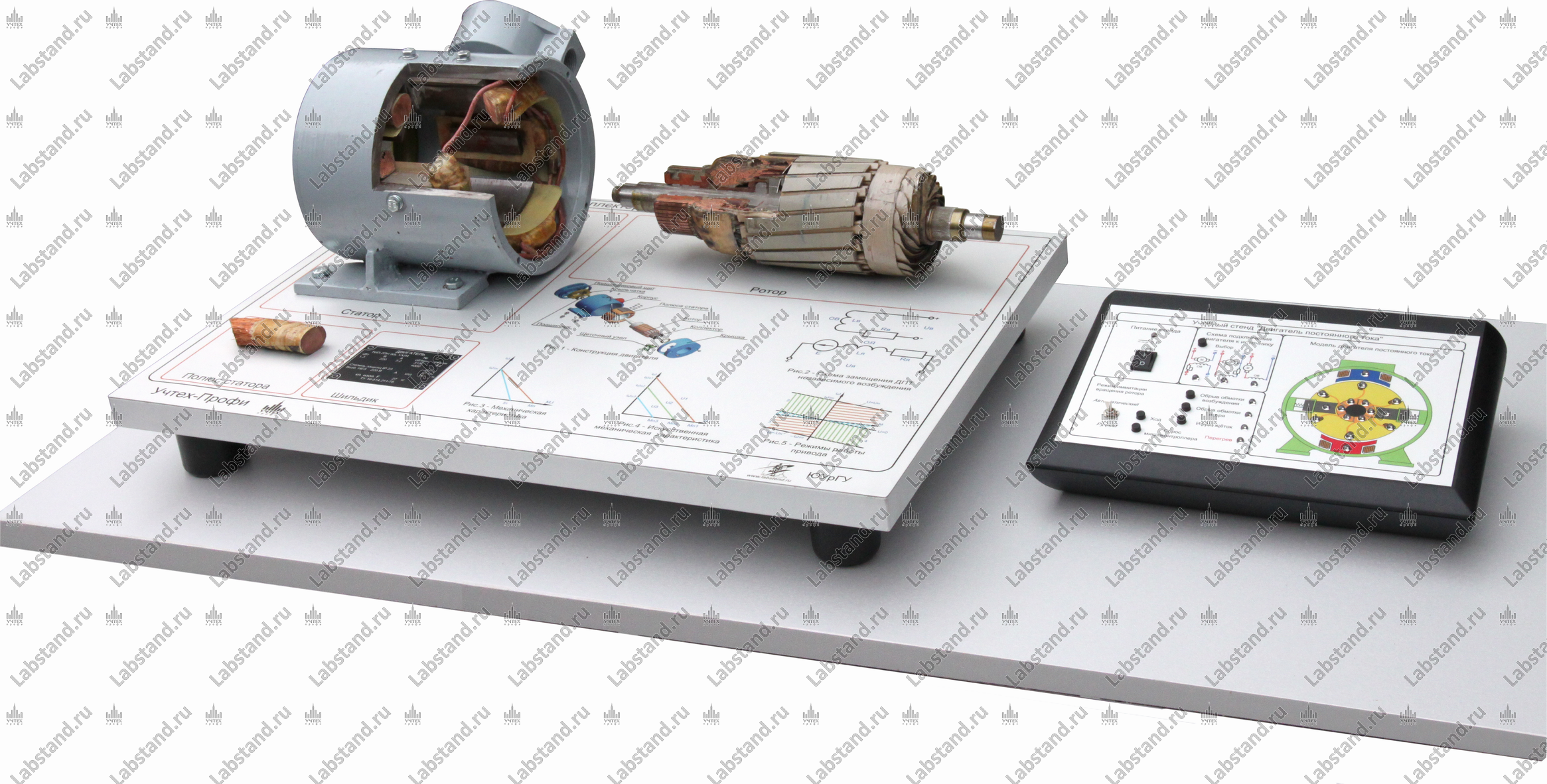 На лицевой панели планшета размещены изображения типовых схем подключения двигателей, изображения принципов работы и конструкции, а так же установлены разрезы натуральных деталей и функциональных элементов реального двигателя постоянного тока.