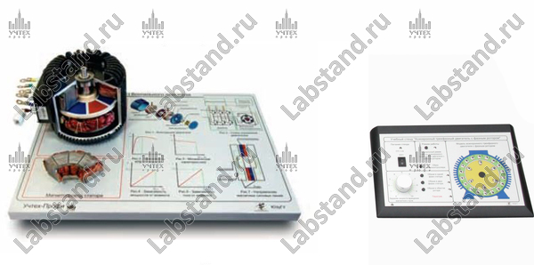 На лицевой панели планшета размещены изображения типовых схем подключения двигателей, изображения принципов работы и конструкции, а так же установлены разрезы натуральных деталей и функциональных элементов реального вентильного двигателя.