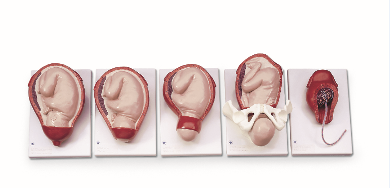 Модель в натуральную величину демонстрирует 5 этапов рождения: плод находится в утробе с закрытым внутренним зевом матки, с открытым зевом матки, начинает появляться головка, головка появляется полностью, отходит плацента.