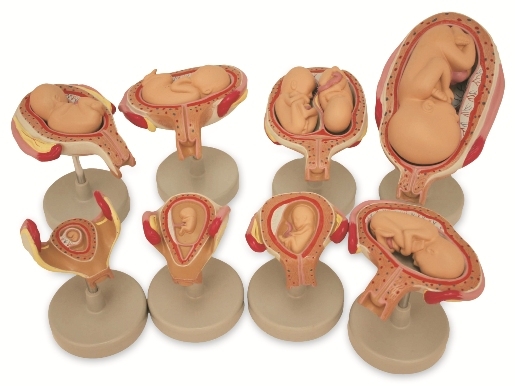 Набор из 8 моделей иллюстрирует различные стадии беременности. Он включает модель эмбриона на первом месяце развития, модель эмбриона на втором месяце развития, модель эмбриона на третьем месяце развития, плод на четвертом месяце развития в поперечном положении, плод на пятом месяце развития в положении тазового предлежания, плод на 5 месяце развития в поперечном положении, модель близнецов на 5 месяце развития и плод на 7 месяце развития. Каждая модель расположена на подставке.