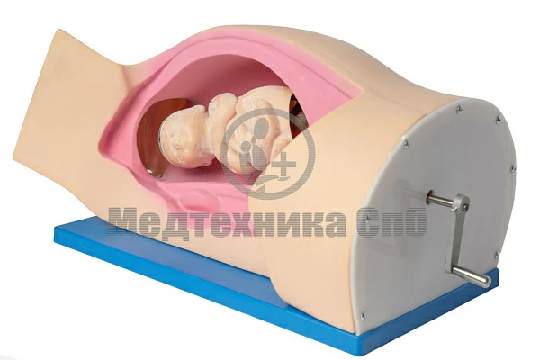 Движение плода во время симуляции процесса родов осуществляется вручную с помощью механического вращения специальным рычагом.