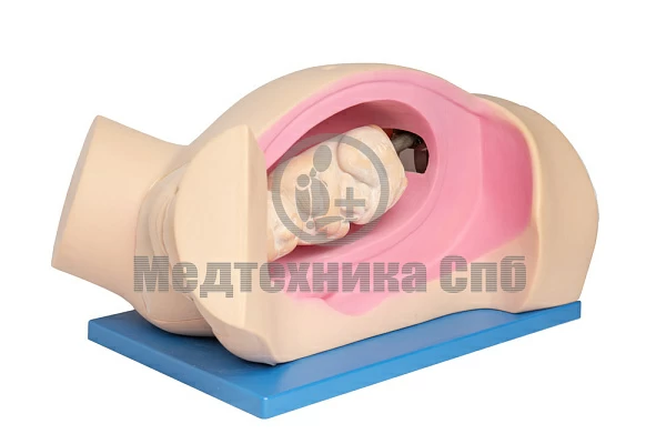Представляет собой форму живота и таза женщины с плодом внутри, в продольном сечении, закрепленный на подставке.