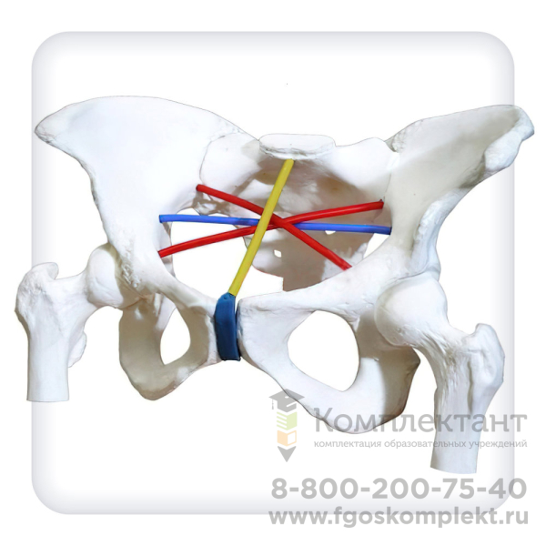 Тренажер представляет собой анатомически точную модель костей женского таза с верхними фрагментами бедренных костей. Воспроизведены все особенности данных костей, их рельеф и топографические области.