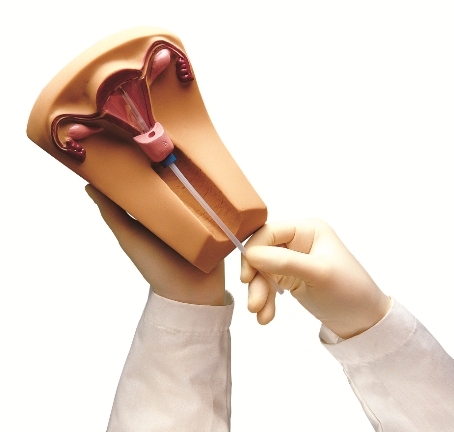Модель матки в саггитальном разрезе с яичниками и фимбриями с прозрачной крышкой. Позволяет демонстрировать введение и установку внутриматочного контрацептива.