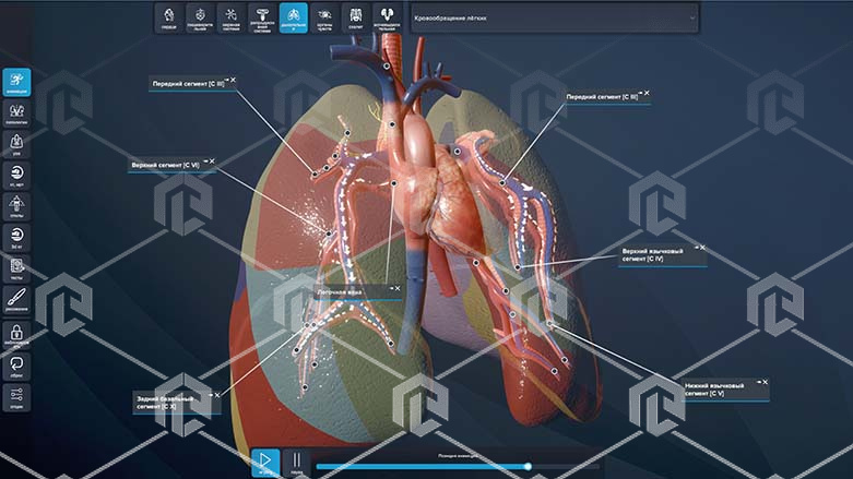 Специализированная версия комплекса с облегченным аппаратным обеспечениеми упрощенной версией ПО без поддержки сетевых функций и визуализации объемныхданных КТ-МРТ. Также снижены системные требования. Состав комплектацииподбирается индивидуально и реализуется только для установки в учебныезаведения начального уровня или в спецучреждения. Комплекс входит в Единый реестр российского ПО. Виртуальный учебный комплекс предназначен для подробного изучения анатомии человека с помощью трёхмерной графики и анимации. Программа воспроизводит всю анатомию человека в одной трехмерной сцене. Это позволяет увидеть взаимное расположение органов и изучить их внутренне строение. Данное программное обеспечение предназначено для работы в настольном режиме или на интерактивной доске в условиях аудитории. В программном комплексе присутствует визуальная дифференциация, а также гибкие средства для отделения необходимых объектов, для более подробного изучения последующим принципам: по гистологическому принципу; по отношению к частям тела; по принадлежности к определенной системе; по слоям, от внешнего к внутренним. Режим просмотра с возможностью взаимодействия с частями модели на экране (touch); Режим изучения патологической анатомии на примерах органов, а также сравнение со здоровым. Функция просмотра подробных моделей органов и систем человека с анимациями и аннотацией.Программное обеспечение поддерживает следующие режимы работы: