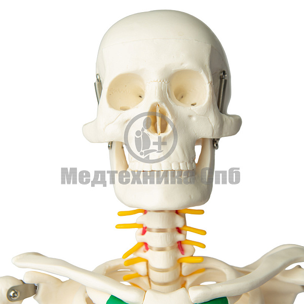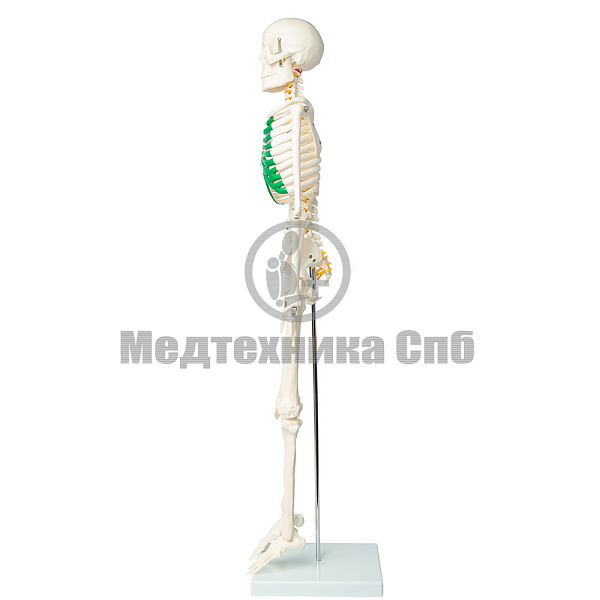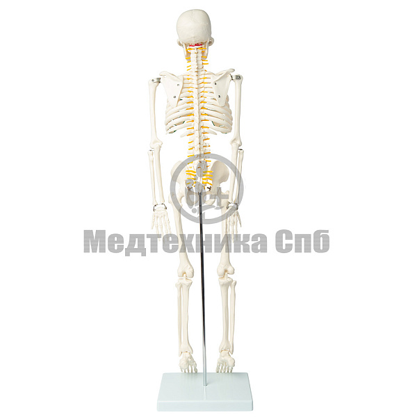 Модель скелета взрослого человека, выполненная в уменьшенном масштабе (высота 80 см). Подвижна в основных суставах, со съёмными нижними конечностями.