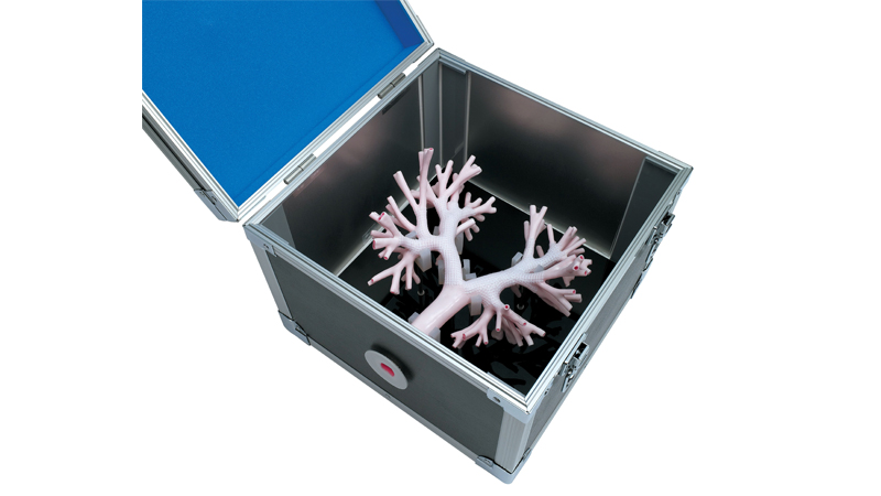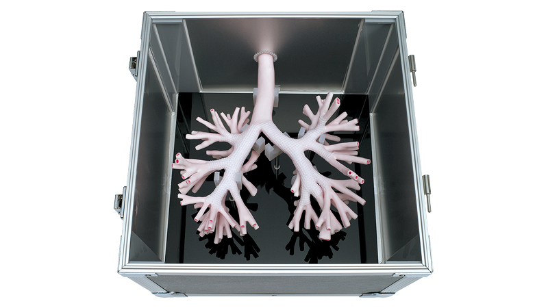 - Тренажер изготовлен из особого силиконового каучука. Благодаря своей эластичности ощущения при введении бронхоскопа воспроизводят реальные ощущения при бронхоскопии у реального пациента. Окраска внутренней поверхности бронхиол приближена к естественной.