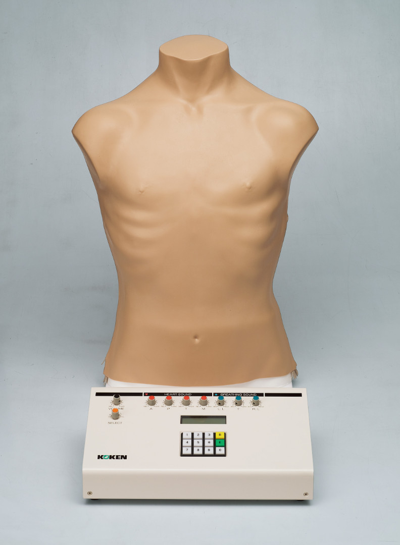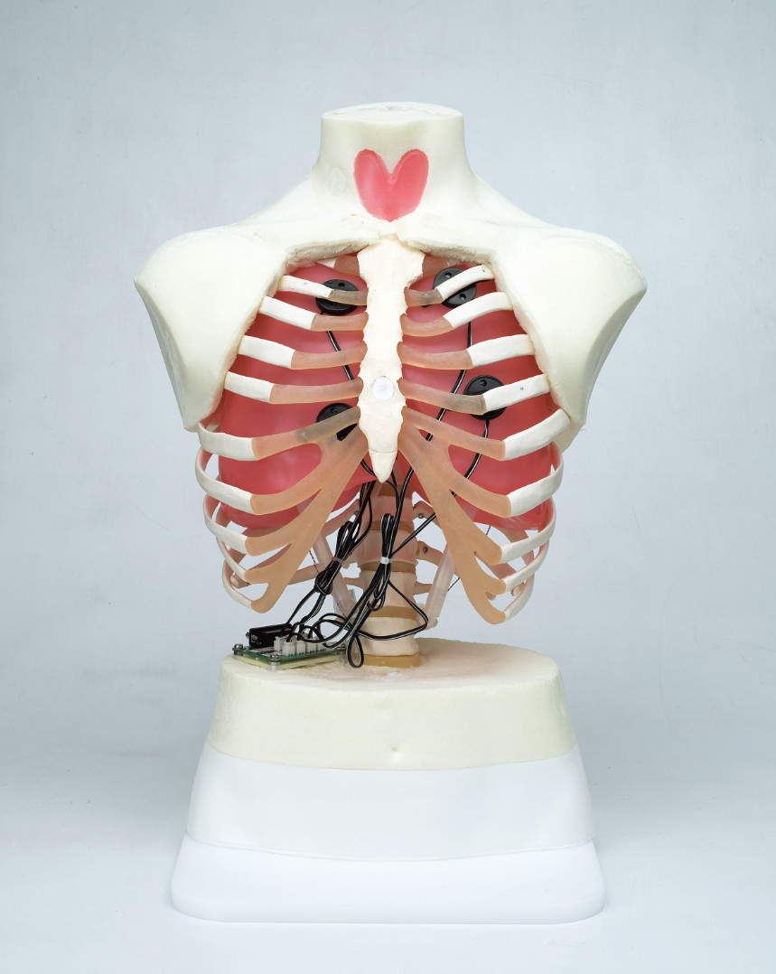 - модель грудной клетки имеет скелет грудной клетки, имитацию легких, встроенные в 4 местах динамики аускультации сердца, встроенные в 3 местах динамики аускультации дыхательных звуков