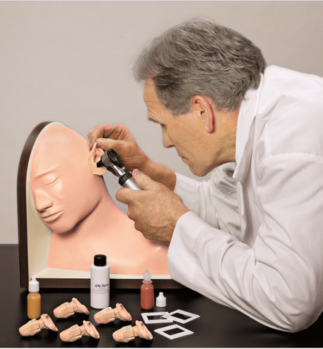 Фантом предназначен для отработки как сестринских, так и врачебных практических навыков: отоскопии, удаления ушной серы, промывания и ухода за наружным и средним ухом. Снабжен пятью сменными муляжами слухового прохода с ушной раковиной (норма и различные распространенные патологии), 9 сменными слайдами и двумя флакончиками с имитаторами ушной серы.