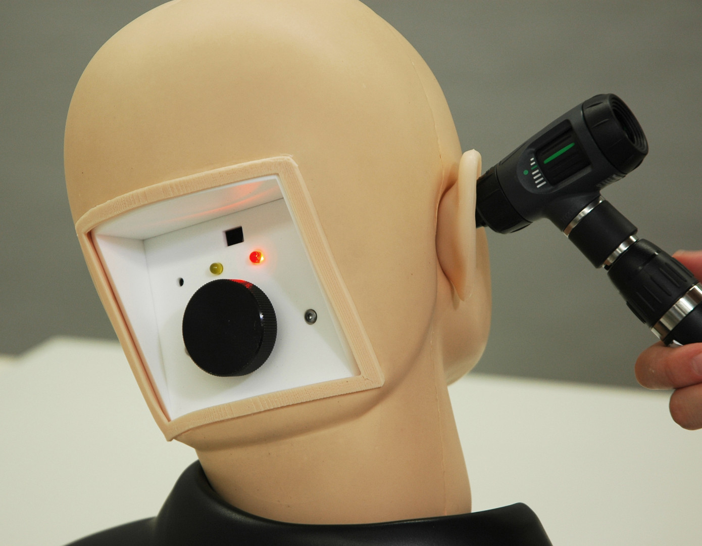 - тренажер предупреждает о слишком глубоком введении отоскопа в ухо при помощи звукового сигнала (вариант самостоятельного обучения) или красного и зеленого световых сигналов без звука (вариант обучения с инструктором)