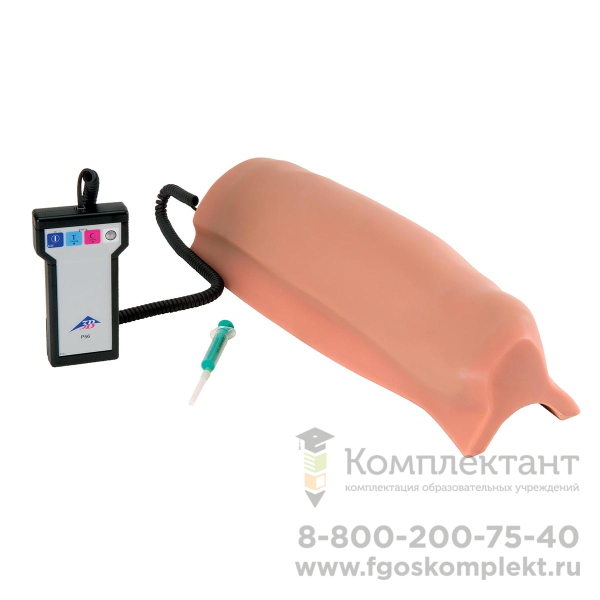 Тренажер покрыт чрезвычайно прочной, имитирующей натуральную силиконовой кожей, которая легко и быстро может быть заменена. Имитатор снабжен двумя батарейками АА, иглами и шприцем 5 мл.