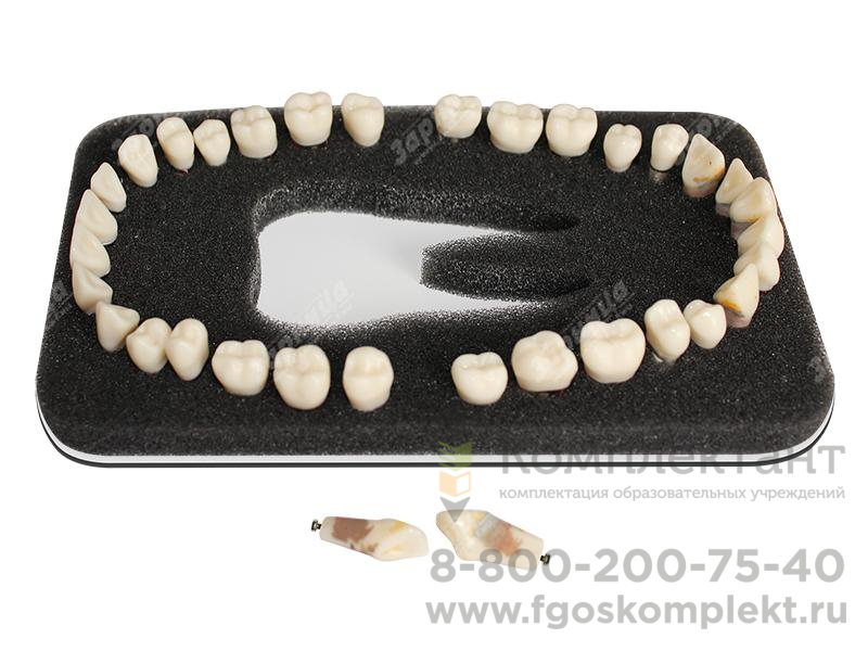 Комплект из 32 модельных зубов естественной формы с винтовым креплением для установки в денто-модель ЧВН-32П. Материал зубов по своим физическим характеристикам максимально приближен к естественным.