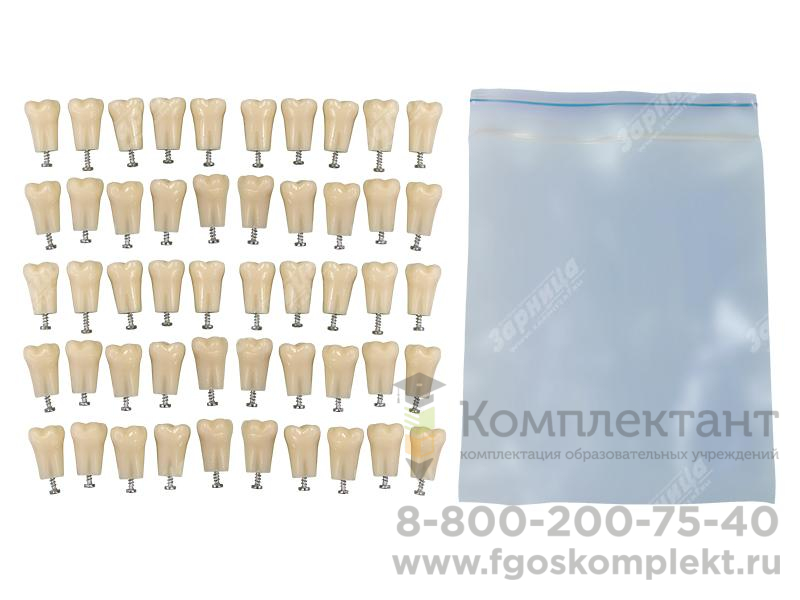 Комплект из 50 модельных зубов одного номера естественной формы с винтовым креплением для установки в денто-модели ЧВН-32. Материал зубов по своим физическим характеристикам максимально приближен к естественным.
