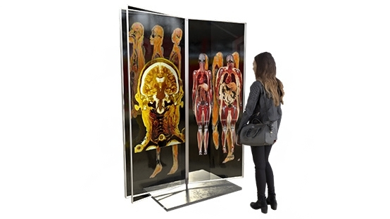 Данная учебная модель представляет собой стенд с металлическим основанием с закрепленными на нем жесткими листами из прозрачного материала. На каждый прозрачный лист нанесены с изображения анатомических структур и ориентиров в соответствии с одной из стандартных проекций. Данный стенд позволяет изучить внутреннюю анатомию человека на основе информации, полученной из замороженных срезов человеческого тела. Стенд позволяет провести изучение анатомии на основе срезов человеческого тела с интервалом в 6 мм. Данный стенд-модель может быть выполнен в трех вариантах, по виду проекции: Аксиальная, Сагиттальная, Латеральная. Количество срезов и их толщина могут быть изменены по желанию заказчика. Также комплекс содержит блок интерактивного сопровождения и озвучки каждого среза с возможностью ее изменения. При переключении среза «перелистывании» прозрачной панели происходит активация следующего нарративного блока с озвучкой на основе представленного среза.