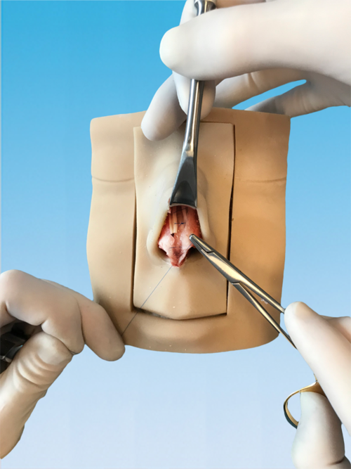 - Многослойная ткань, включая кожу, гиподерму и покрытую слизистой оболочкой надхрящину с реалистичными плоскостями рассечения