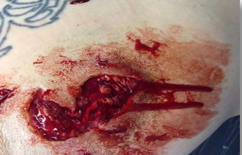 3-дюймовое типичное повреждение тканей/выходное отверстие огнестрельного ранения. Активно кровоточит при использовании кровопроводящей магистрали
