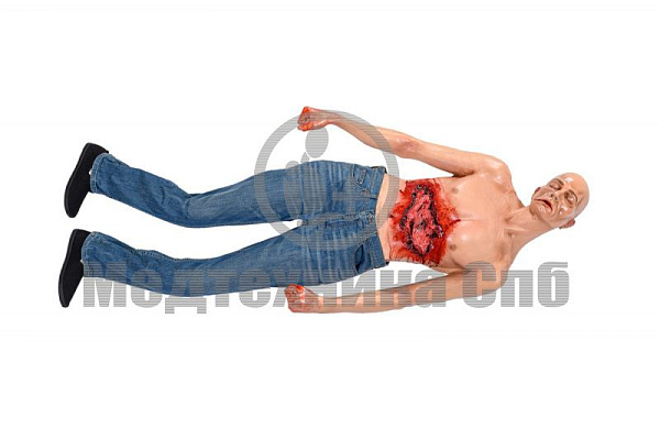 Полноразмерный манекен, имитирующий тело человека, погибшего в результате ранения в области живота с закрытыми глазами.
