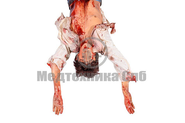 Полноразмерный манекен, имитирующий труп человека, которого подвесили за лодыжки. С закрытыми глазами.