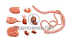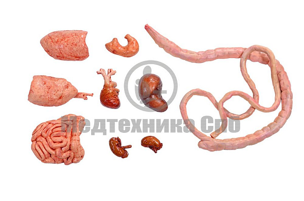 Тело вскрыто, открывает обзору съёмные внутренние органы (2 лёгких, сердце, желудок, печень, 2 почки, кишечник).