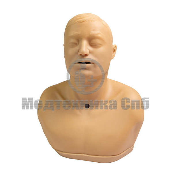 Манекен-тренажёр предназначен для демонстрации и обучения навыкам ухода за трахеостомой и отсасывания мокроты. Представляет собой точную анатомическую модель торса и головы взрослого пациента (имитация гортани, надгортанника, трахеи, пишевода). Модуль головы можно переводить в положение для трахеостомии.