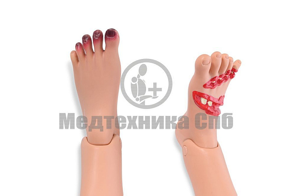 Обработка ран и наложение швов, первая помощь при переломах. Манекен укомплектован модулями ран: инфицированная рана бедра, ампутационная рана мизинца стопы, гангрена стопы и пальцев, закрытый перелом бедра, открытый перелом правой стопы.