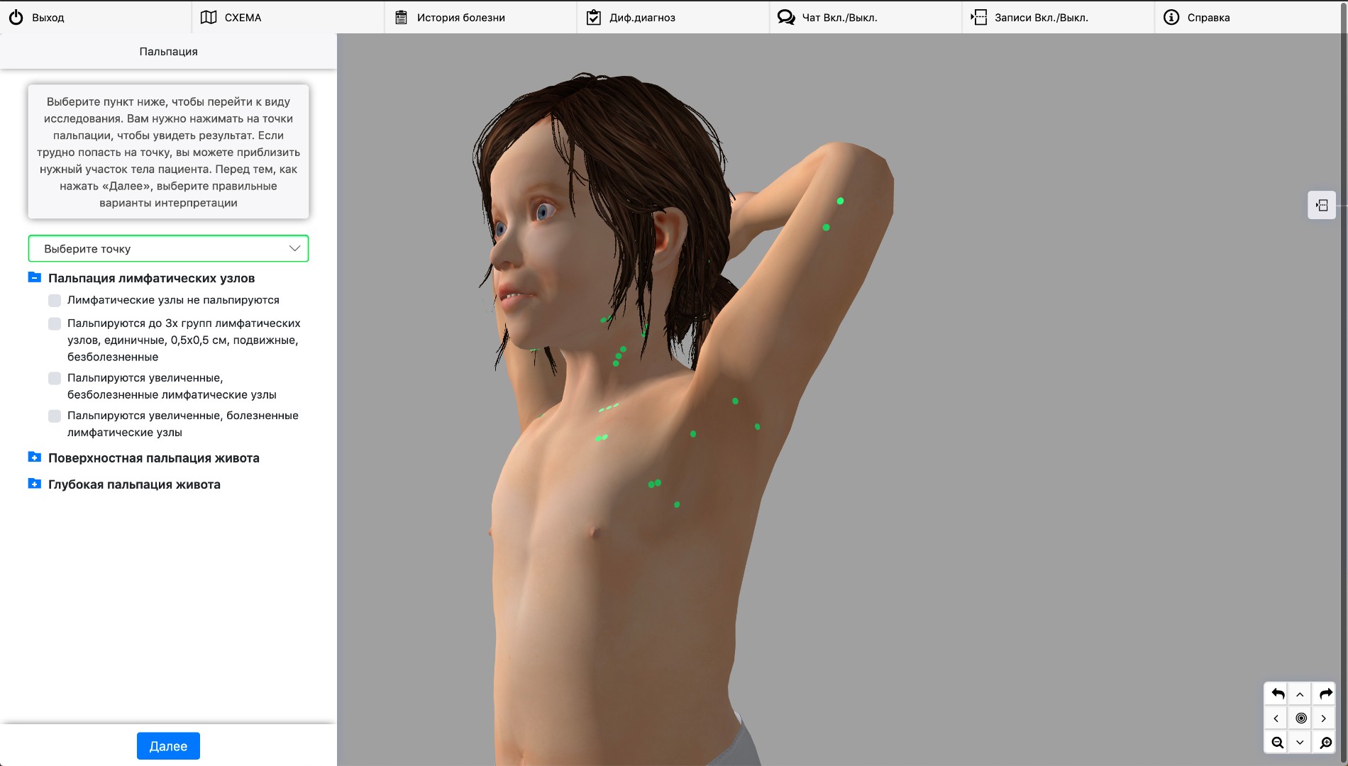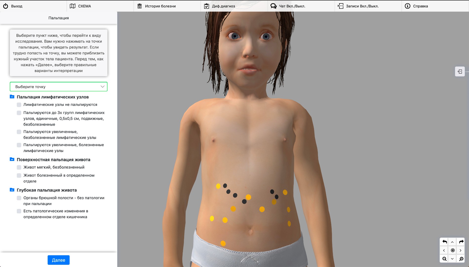 Пользователь имеет возможность указать на стандартные точки на теле ребенка, в которых необходимо провести пальпацию или перкуссию с последующим отображением результата на экране. Этап аускультации сопровождается воспроизведением соответствующих аудиофайлов для каждой выбранной точки.
