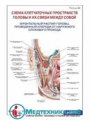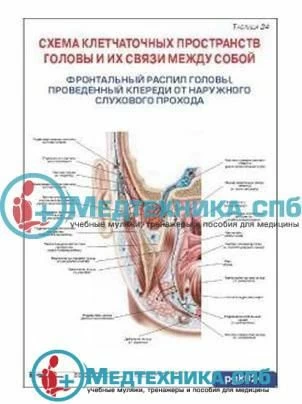 024 Схема клетчаточных пространств головы и их связи между собой. Фронтальный распил головы, проведенный кпереди от наружного слухового прохода. (русский/латынь) (арт. 24)