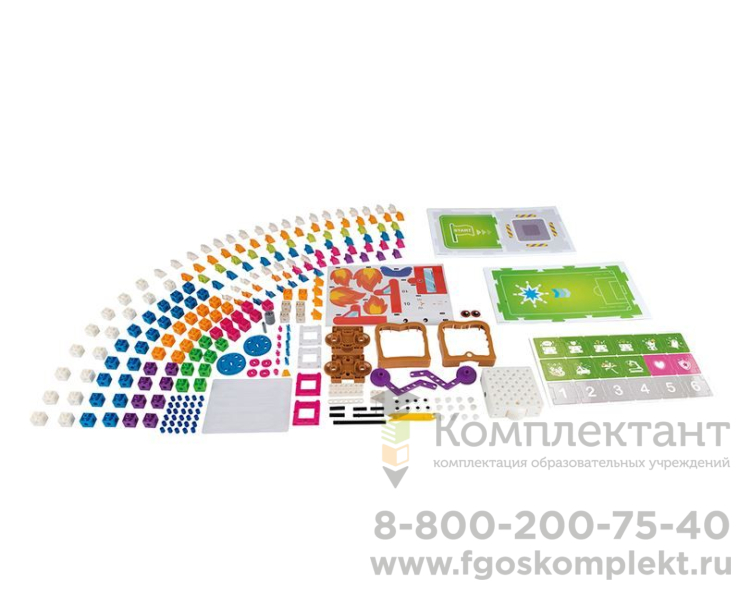 В состав набора входит: Программируемая подвижная платформа, кубики, призмы, штифты, оси, шестерни, балки, рамки и т.д., а так же двухсторонние карточки с кодами - 108 штук. Поле для выполнения задач робота, выполнено по принципу пазла из высококачественного картона, состоит из 19 двухсторонних частей.
