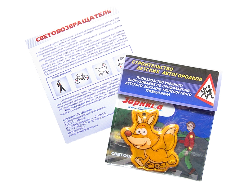 Световозвращающая подвеска высокого качества представляет собой элемент в виде лисенка, выполненный из скрепленного между собой эластичного световозвращающего материала. Коэффициент световозвращения поверхности подвески составляет 200 кд/лк*м2 согласно требованиям ГОСТ Р 50971-2011. Цвет световозвращающего материала - оранжевый. На лицевой стороне подвески с применением УФ-печати нанесен цветной тематический рисунок, соответствующий возрастной категории (дошкольники и школьники): "Лисенок".