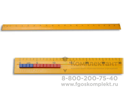Линейка размером 103*5 см изготовлена из пластика. Вдоль линейки сделан желоб шириной 11 мм для выкладывания счетных элементов. С левой стороны желоба установлен ограничитель. Над желобом нанесена сантиметровая разметка с оцифровкой через пять сантиметров.