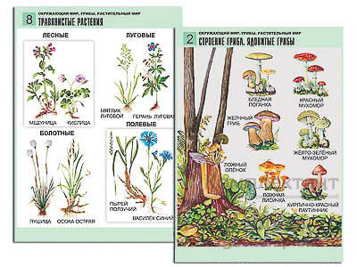 Таблицы: 1. Строение гриба. Съедобные грибы. 2. Строение гриба. Ядовитые грибы. 3. Части растения. 4. Многообразие растений. Лиственные деревья. 5. Многообразие растений. Хвойные деревья. 6. Многообразие растений. Кустарники. 7. Лишайники. Водоросли. Мхи. Папоротники. 8. Травянистые растения. 9. Размножение растений. 10. Культурные растения. 11. Ядовитые растения. 12. Растениеводство.
