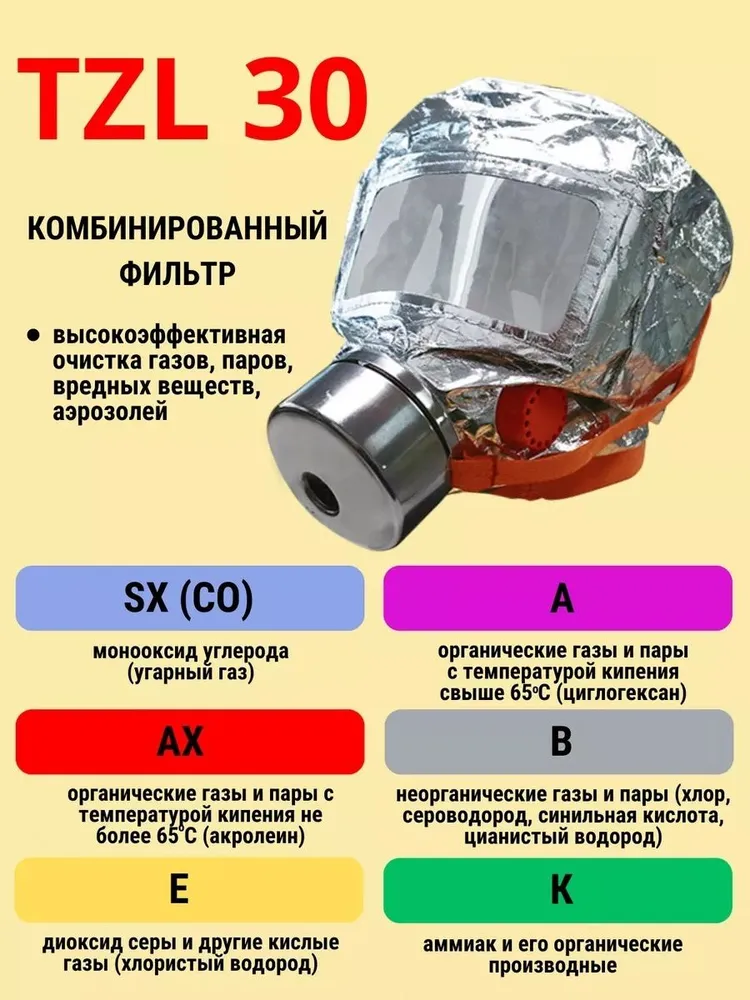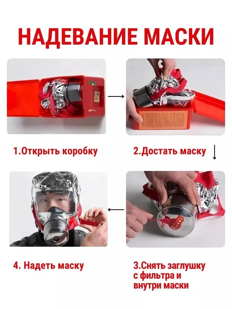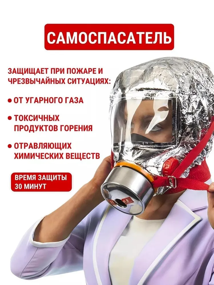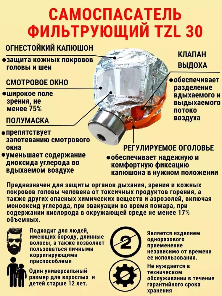 Самоспасатель фильтрующий используется при пожаре для эвакуации из задымлённых помещений. Имеет все необходимые сертификаты, подтверждающие качество. Осуществляет индивидуальную защиту органов дыхания и глаз человека от воздействия токсичных продуктов горения и других опасных химических веществ. Смотровое окно 75 % поля зрения. Объемный капюшон создает воздушную подушку для защиты от перегрева. Защита от монооксида углерода - главного продукта горения не менее 30 минут. Не нуждается в техническом обслуживании в течение гарантийного срока хранения (3 года). Изделие одноразовое, можно использовать для взрослых и детей старше 12 лет. Вскрывать только в случае пожара, аварии. Запрещается использовать при содержании кислорода в окружающей среде менее 17% объёмах. Самоспасатель упакован в удобную опломбированную пластиковую коробку.