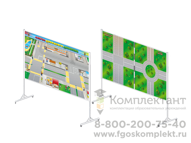 Двухсторонняя магнитно-маркерная доска представляет собой информационную панель на стойках, на лицевой стороне которой изображена "Азбука дорожного движения", а на оборотной – четырехсторонний перекресток и круговое движение.