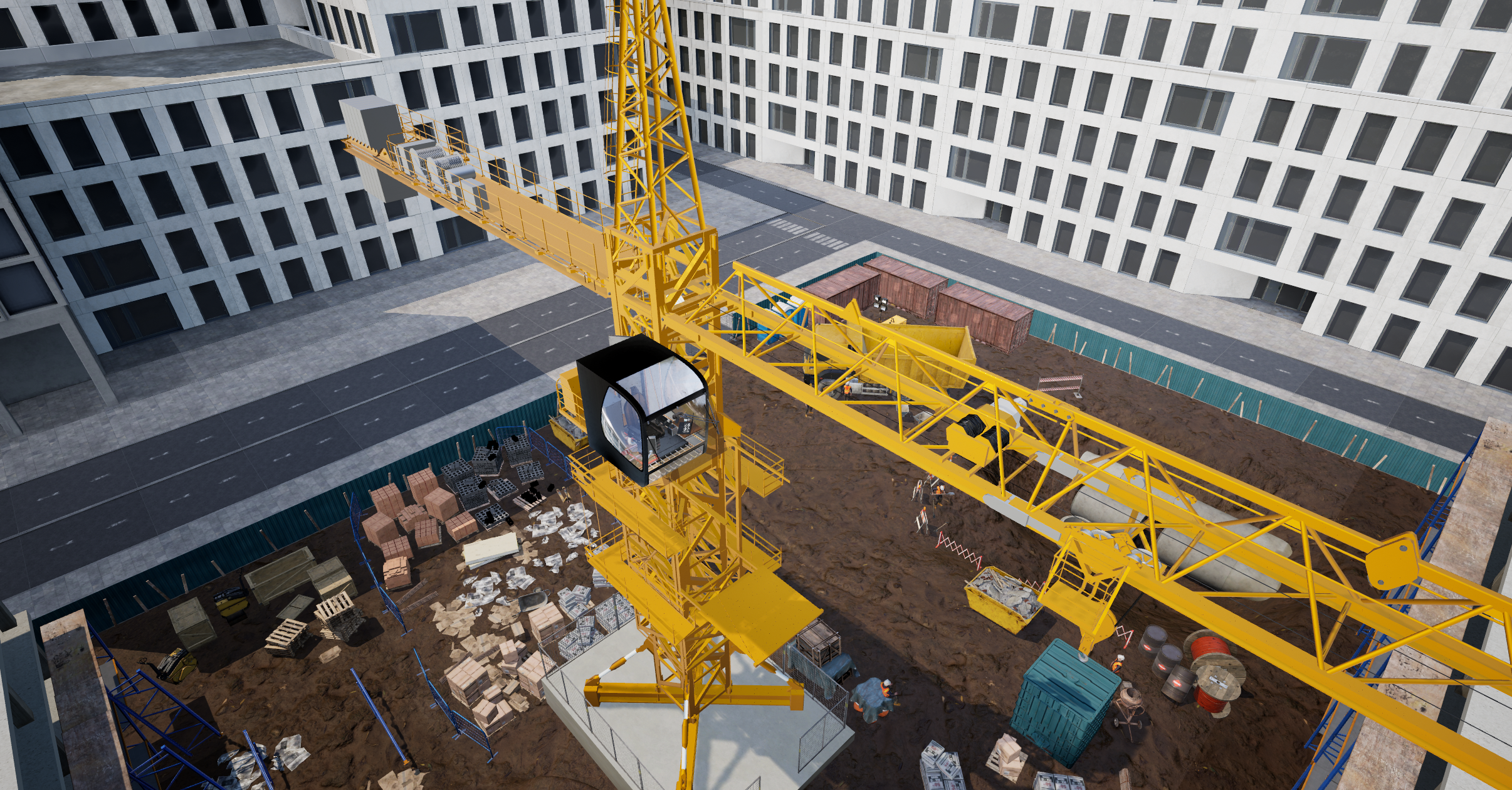 Модуль симулирует работу оператора башенного крана. Необходимо перенести груз с земли на крышу строящегося здания. Пользователь находится в виртуальной кабине башенного крана на строящемся объекте. В кабине находятся рычаги управления краном, дисплей, отображающий в режиме реального времени необходимые параметры работы крана, ноутбук с описанием задания. Пользователь при помощи контроллеров управляет работой башенного крана и проходит необходимые этапы по перемещению груза.