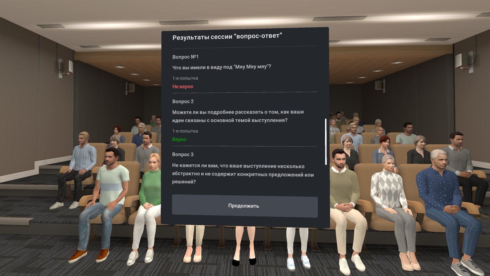 Тренажёр “Публичные выступления” в виртуальной реальности с системой анализа речи и жестикуляции позволяет приобрести и развить навык общения с публикой.